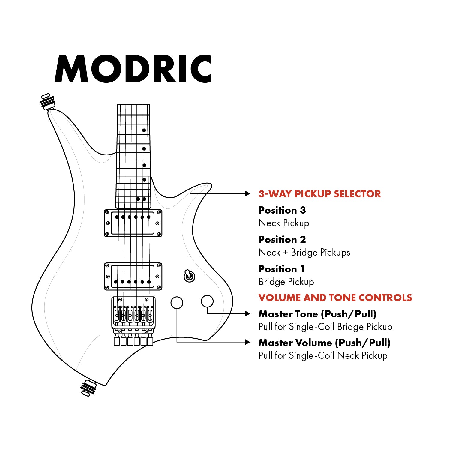 Following on from the success of our awesome range of headless guitars and basses, the Artist MODRIC is a slightly higher-end offering, with a host of unreal features making this one of our most playable and ergonomic designs yet. Featuring a quarter-sawn Canadian Maple neck, stainless steel frets, a bone nut, wheeled string tree, and auto-lock strap buttons, the MODRIC has been designed with the player in mind - every little detail combines to ensure playability and tuning stability is as close to perfect as possible!