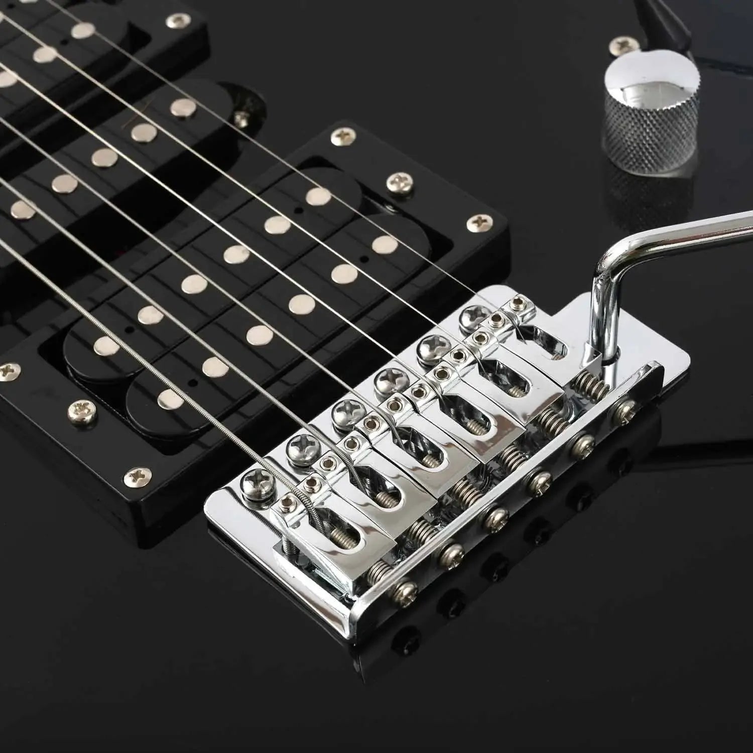 It has a classic style bridge (so you can do classic style tremolo and string bends) & die-cast machine heads that will help you stay in tune longer and make your tuning easier.