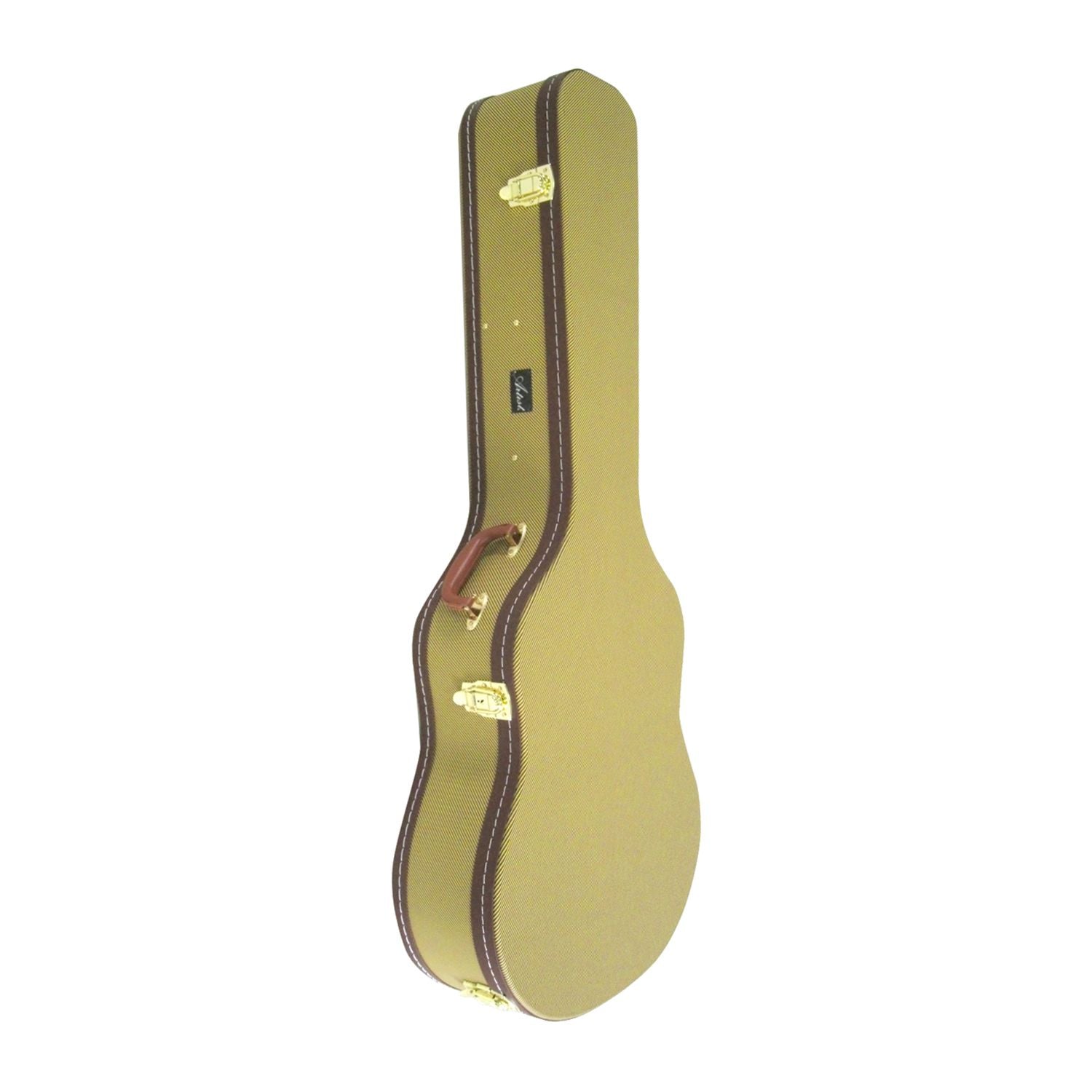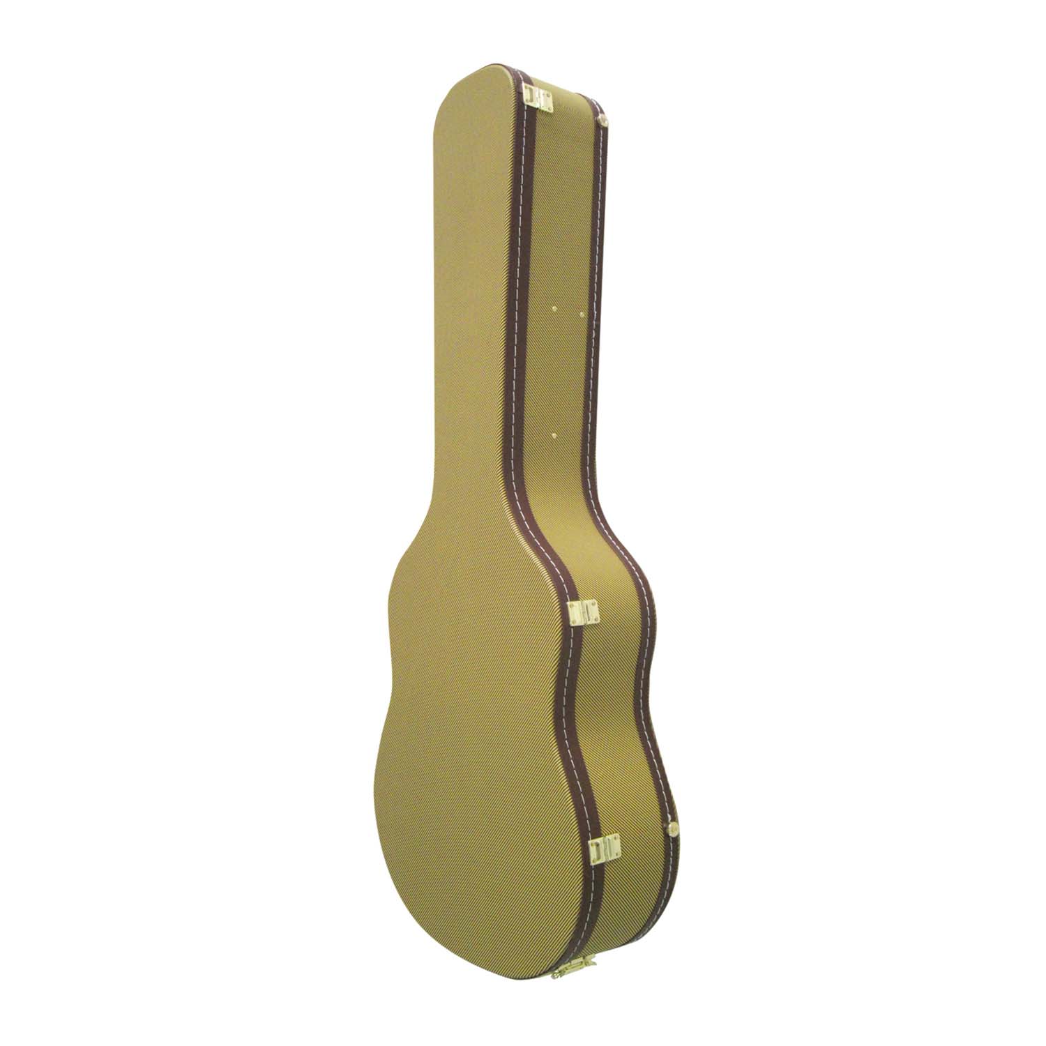 This Hard Case will fit a Dreadnought Acoustic Guitar (6 string or 12 string) and keep it safe and sound (if you're not sure if your guitar is a dreadnought just email us the brand and model and we can check for you), It has sturdy wooden construction with a lockable Latch (the key is inside the case). It has a great little compartment for all your accessories and spare strings. Tweed PVC, Wine Red Plush, Padding Handle, Brown PVC Binding with Silver Stitching and Golden Latches.