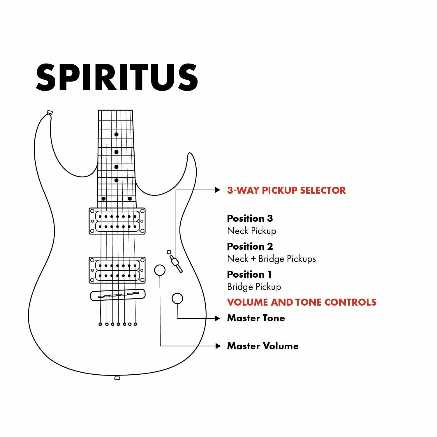 The Artist Spiritus7 is the perfect introductory 7-string guitar to take you on your journey into the world of low-tuned Metal and Djent. This guitar has a black gloss Poplar body, a Canadian Maple Bolt-on neck, a black anodized tune-o-matic bridge, and a string-thru-ferrule tail for the best sustain possible. The controls are simple and effective - 1 volume, 1 Tone, and a 3-way selector.