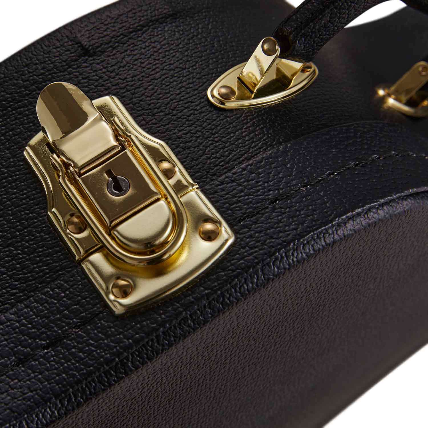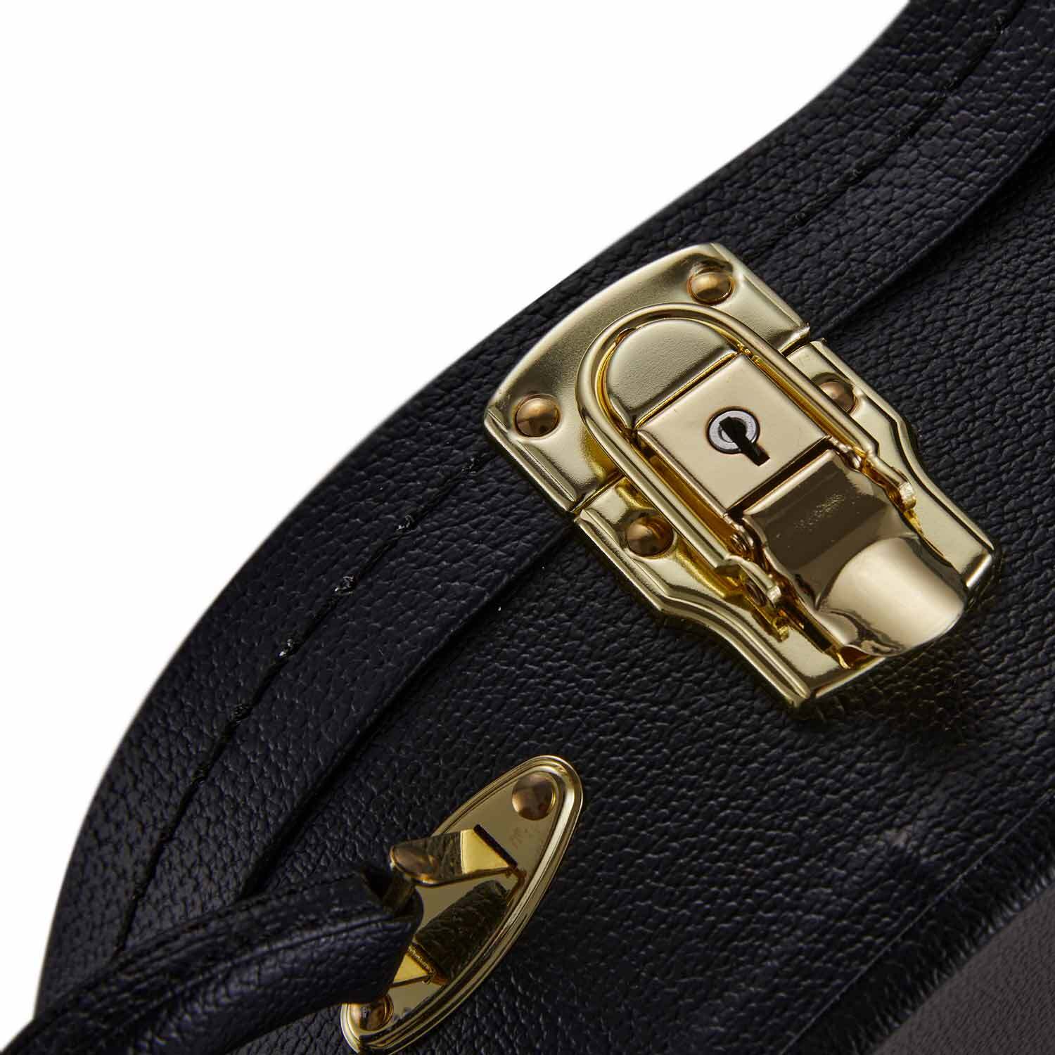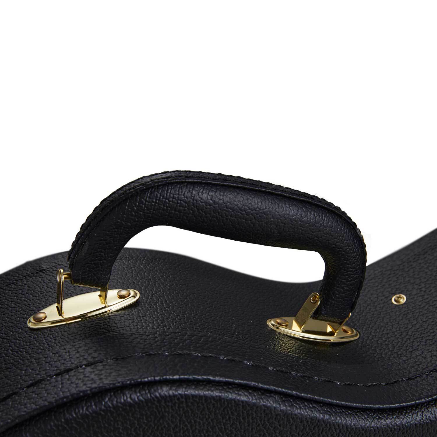 This Hard Case has sturdy wooden construction with a lockable Latch (the key is inside the case). It has a great little compartment for all your accessories and spare strings. It also has a small pad to support the body.