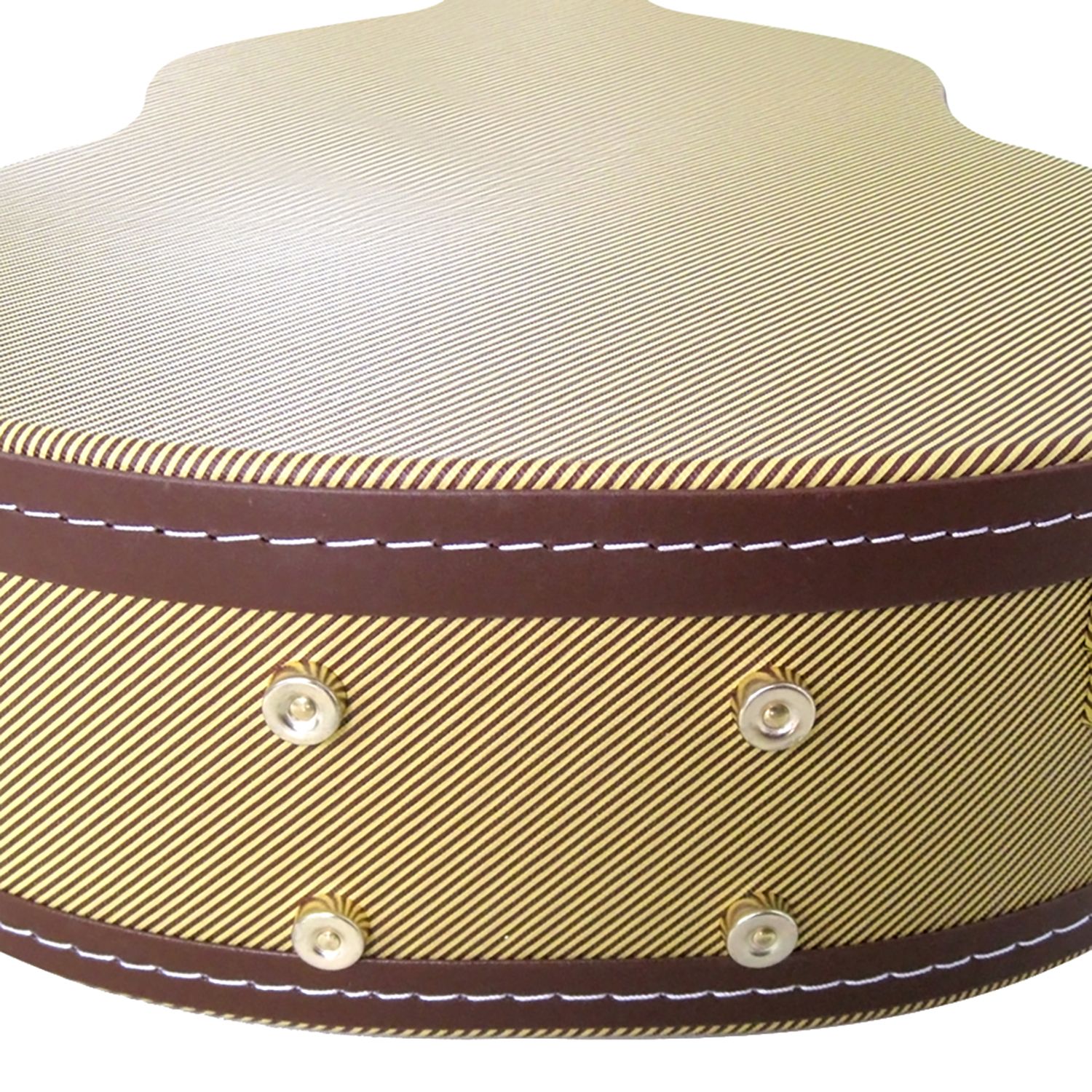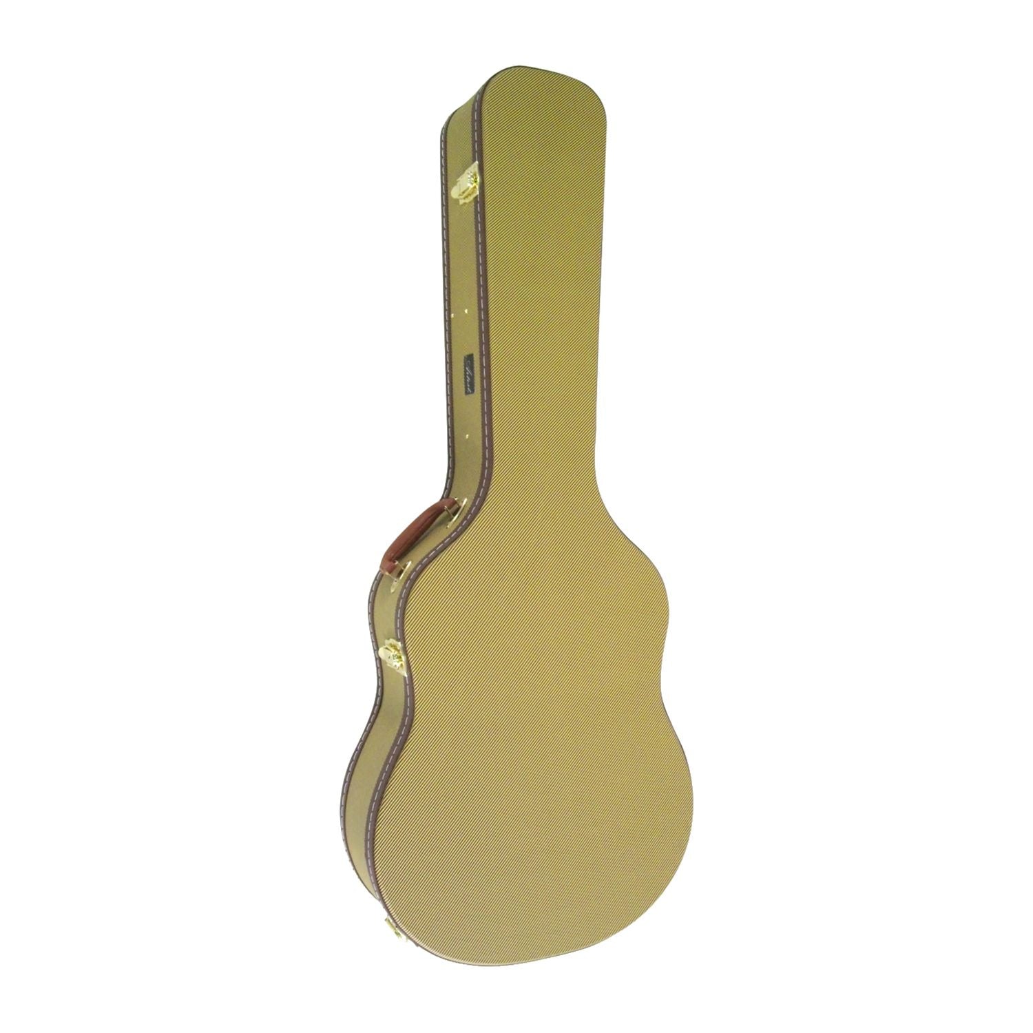 This Hard Case will fit a Dreadnought Acoustic Guitar (6 string or 12 string) and keep it safe and sound (if you're not sure if your guitar is a dreadnought just email us the brand and model and we can check for you), It has sturdy wooden construction with a lockable Latch (the key is inside the case). It has a great little compartment for all your accessories and spare strings. Tweed PVC, Wine Red Plush, Padding Handle, Brown PVC Binding with Silver Stitching and Golden Latches.