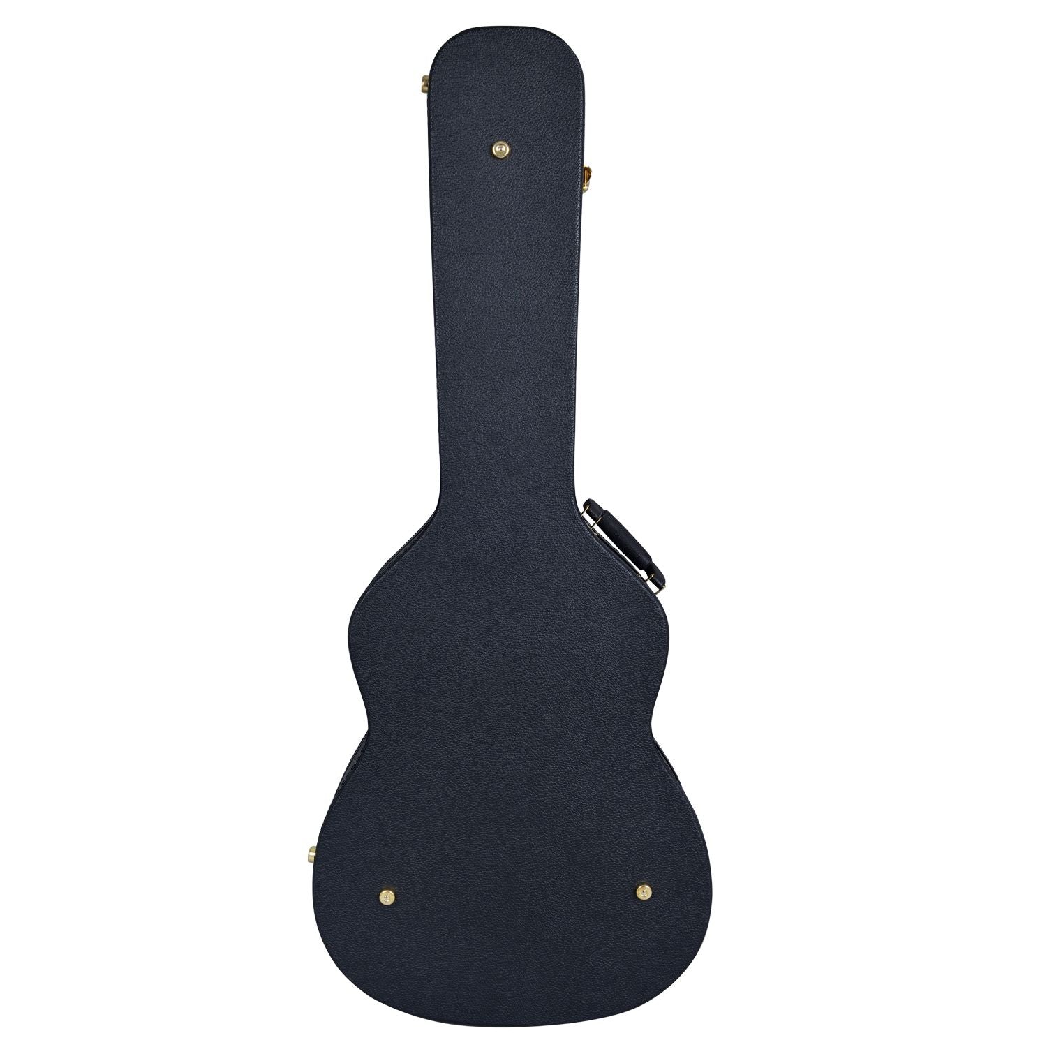 This Hard Case will fit an OM, Resonator, APX sized or a Smaller Jazz Guitar. It has a sturdy wooden construction with a lockable latch (the key is inside the case). It has a great little compartment for all your accessories and spare strings.