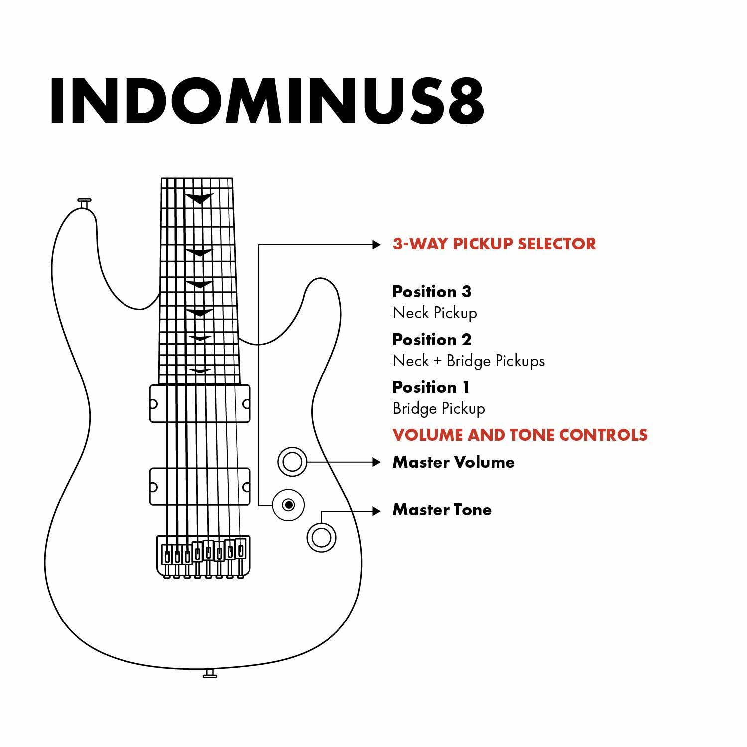 The Indominus8 combines sleek looks with performance hardware and features a gloss-black basswood body with a maple bolt-on neck. The black chrome hard-tail string-through bridge ensures that the instrument has great sustain to achieve that metal wail, and the two-way truss rod ensures this can be set up for thick strings and low tunings so you can chug away with no issues. The controls are simple and effective, 1 volume, 1 Tone, and a 3-way Toggle selector, and the guitar is factory-fitted with 10-74 gauge strings.